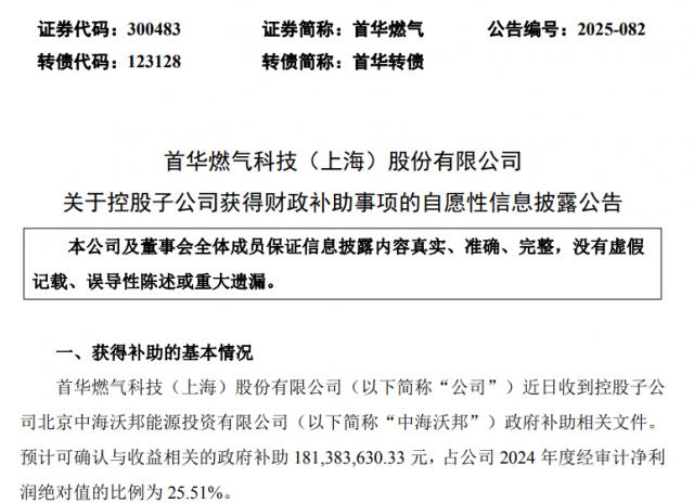 公告内容显示,首华燃气科技(上海)股份有限公司近期收到控股子公司北京中海沃邦能源投资有限公司的政府补助相关文件,经确认,该补助为与收益相关的政府补助,金额预计达1.81亿元,占公司2024年度经审计净利润绝对值的25.51%。