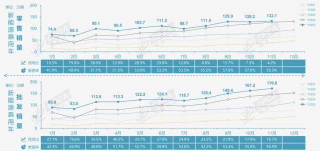 虽然新能源乘用车零售增速放缓,但相比整体市场仍显活力。11月其生产、批发、零售量分别为175.7万辆、170.6万辆、132.1万辆,同比增18.3%、18.7%、4.2%,环比增6.3%、5.8%、3%。