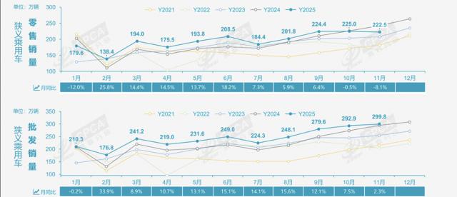 此前两年,国内乘用车市场年末翘尾特征明显,在金九银十传统旺季之后,零售销量会持续攀升。不过今年这一走势却未如期出现,11月零售销量同比环比双双下滑。