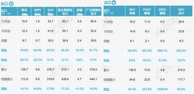 11月乘用车出口(含整车与CKD)60.1万辆,再创新高,同比增52.4%;1-11月累计出口515.1万辆,同比增17.2%。