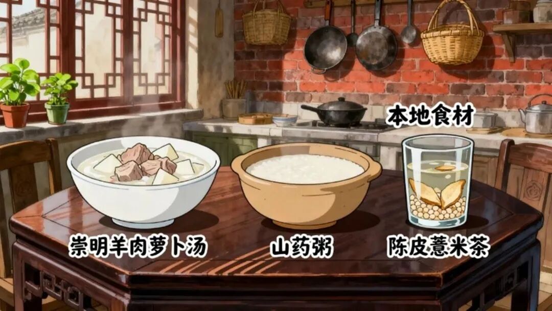 多吃本地温补食材:选择崇明羊肉、本地土鸡等温补肉类,搭配生姜、花椒等调料,煮成崇明羊肉萝卜汤、当归炖鸡,可补气血、暖脾胃;食用大白菜、塌棵菜、白萝卜、山药等蔬菜,易消化且有助于营养吸收。