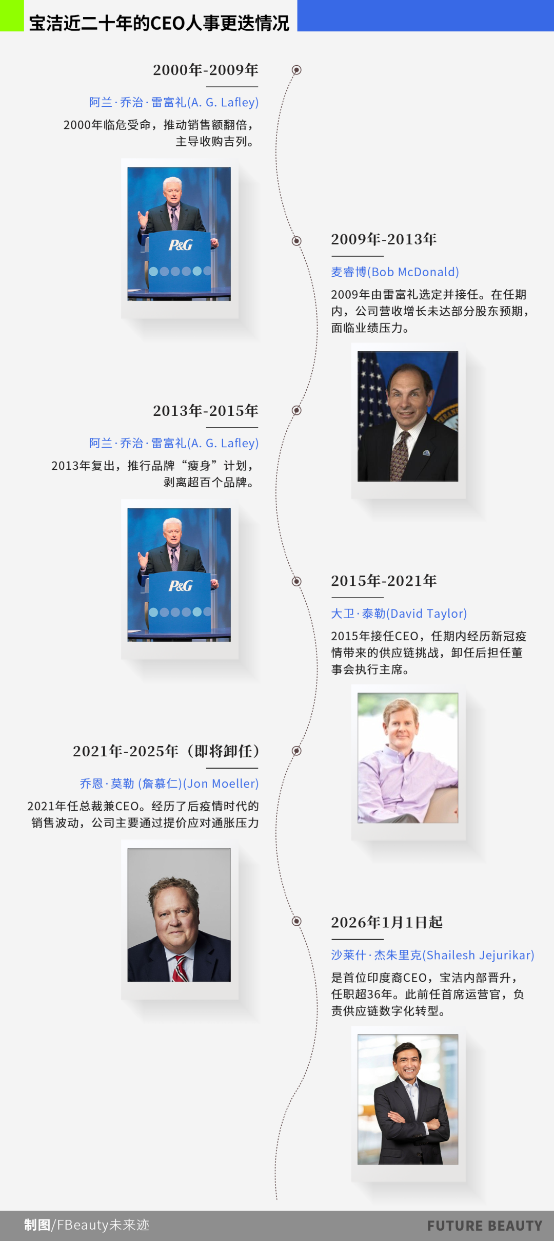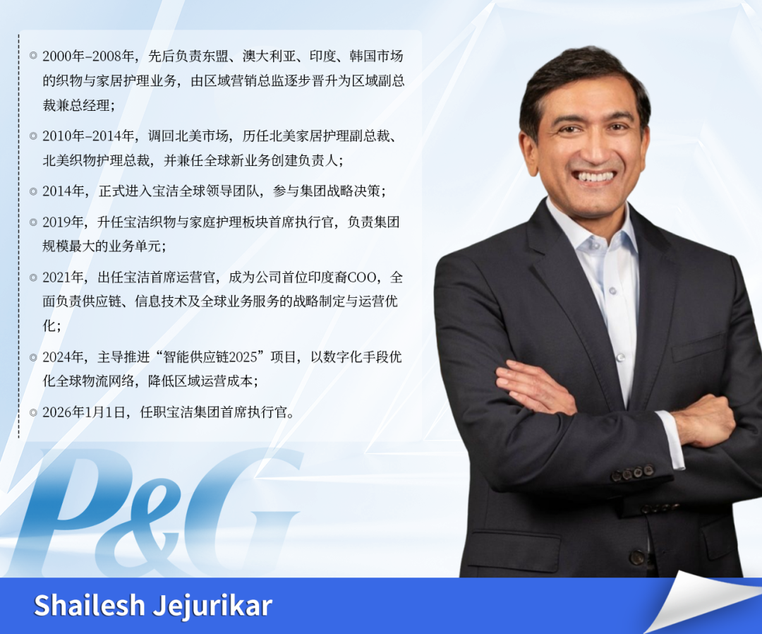 距离宝洁现任首席执行官Jon Moeller(詹慕仁)正式交棒仅剩不到一个月,这家全球日化龙头下一阶段的增长路径,已成为行业焦点。2026年1月1日,在宝洁历练36年、深度参与近年组织与供应链变革的首席运营官Shailesh Jejurikar将接任,成为近20年第五位“一把手”。