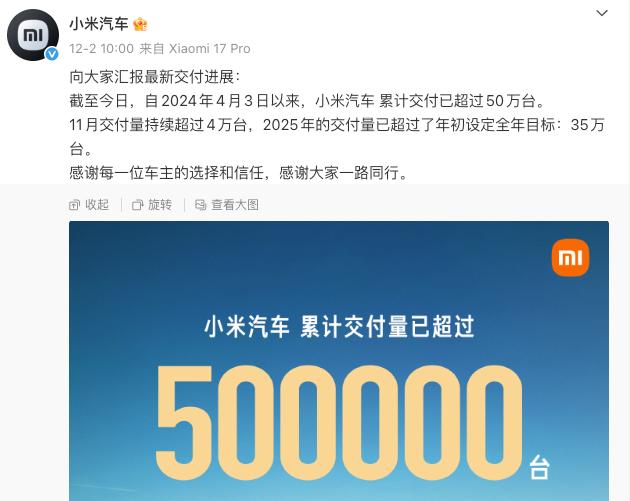 官方数据显示,从2024年4月至今,小米汽车累计交付量已超50万台;上个月交付量持续突破4万台;2025年交付量已提前完成35万台的全年目标。