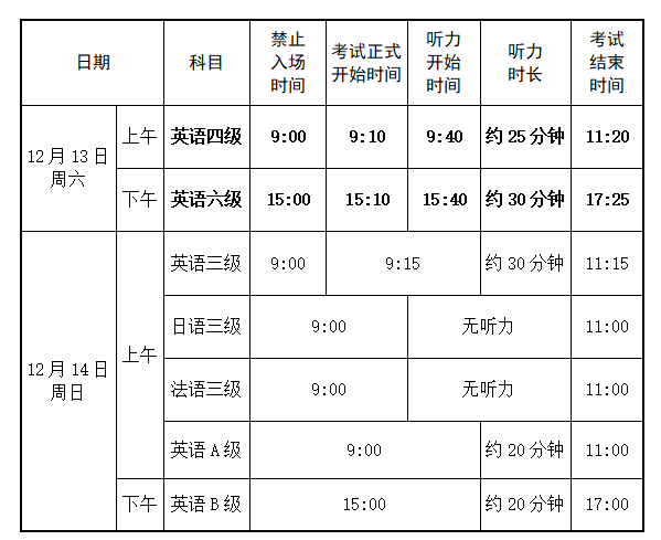 特别提醒:考生须按规定时间进入考场。四级、三级、A级考试9:00后,六级、B级考试15:00后,迟到考生将被禁止进入考场。