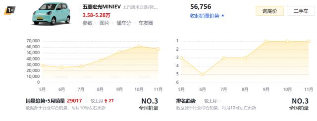 时隔两年多,宏光 MINIEV 再度走红。今年 9 - 11 月,它连续三个月成为国内新车销量冠军,其中 10 月销量突破 6 万台,远超第二名。
