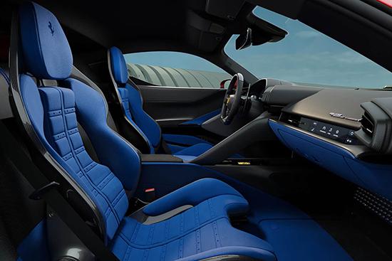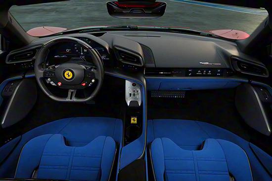 内饰方面,新车采用了全新的设计风格,中控区域的按键布局更为简洁直观。全液晶仪表盘采用了曲面屏设计,其UI界面复刻了经典Testarossa车型的红色转速表元素,充满复古与科技的融合感。HUD抬头显示系统的投影面积相比SF90增大了30%,能够实时显示混动系统的能量流状态。此外,一键启动和ESC关闭等关键按键均设置在方向盘上,进一步强化了车辆的赛车基因。