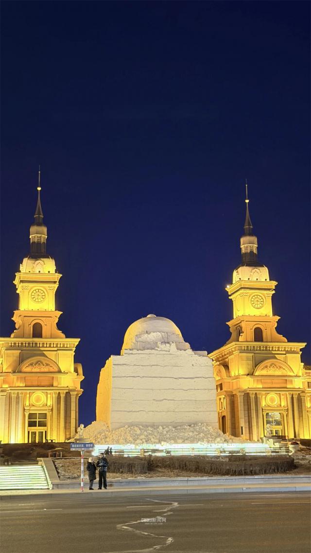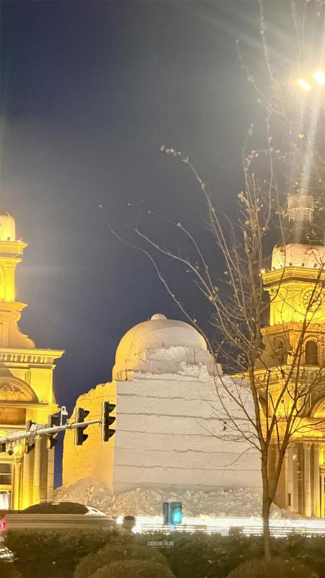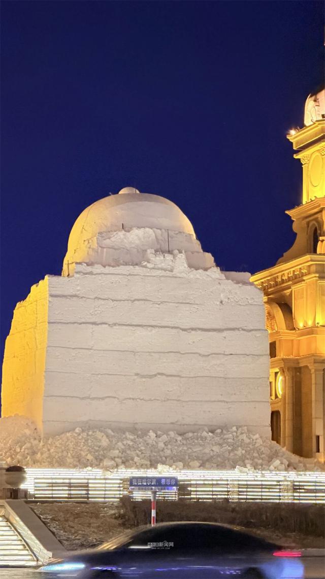 11日晚,记者来到建造现场。远远望去,大雪人像“蹲”在巨大的白色“盲盒”里,只待揭开真容,模样可爱又吸睛。走近看,圆滚滚的帽子已稳稳成型,在夜晚灯光下格外醒目。以帽子为参照,雪人圆脑袋和比往年更高的庞大身躯轮廓清晰起来,虽身体仍被雪坯包裹,但那圆润憨厚、带着治愈笑容的经典模样已可想象。