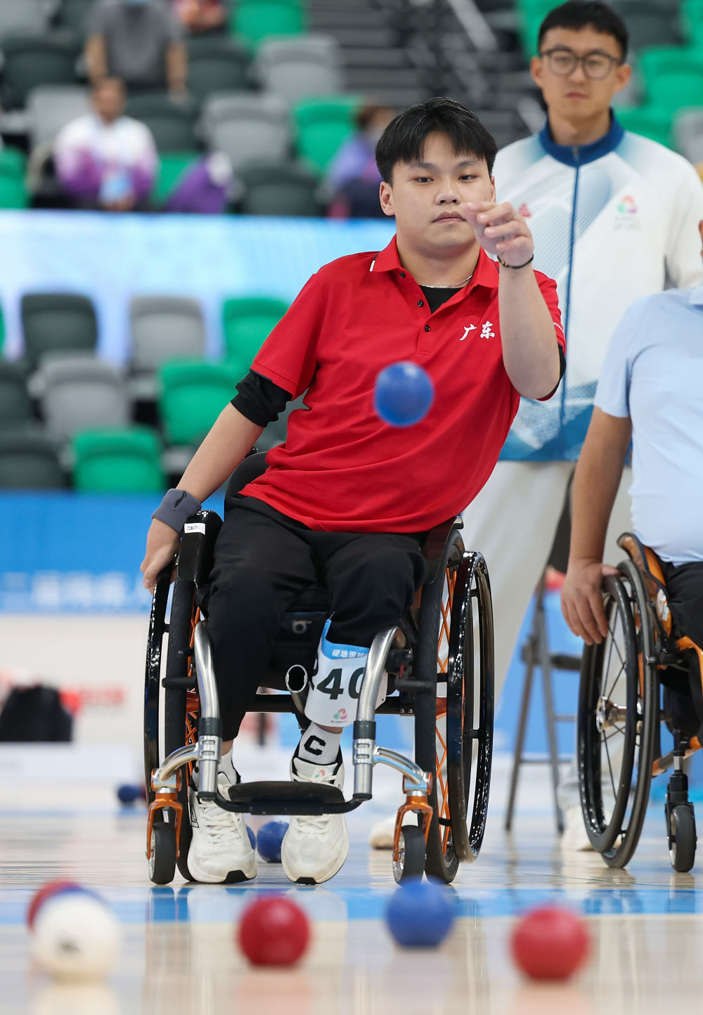 这份回报来之不易。今年10月,广越想才为了参赛恢复系统训练,两个多月里几乎每天三练,一练就是八九个小时,只为让竞技状态回到稳定水平。而在这之前,他把大部分精力都放在了工作上——他是广州市社会福利院的体育老师,专门带着16名学生练硬地滚球。
