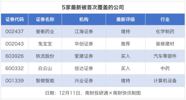 在首次覆盖方面,12月11日券商总共进行了5次首次覆盖操作。其中,誉衡药业被江海证券给予“增持”的评级,兔宝宝获得华创证券给出的“推荐”评级,铁流股份得到爱建证券的“买入”评级,白云山被信达证券评定为“买入”级别,智微智能则获得兴业证券的“增持”评级。