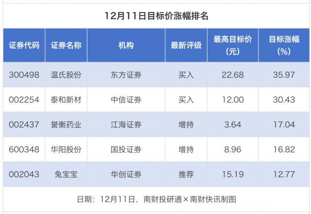 南财投研通的数据表明,12月11日当天,券商针对上市公司给出了5次目标价评估。以最新收盘价为计算基准,目标价涨幅靠前的企业包括温氏股份、泰和新材以及誉衡药业,它们的目标价涨幅依次达到35.97%、30.43%和17.04%,所属行业分别为养殖业、化学纤维业和化学制药业。