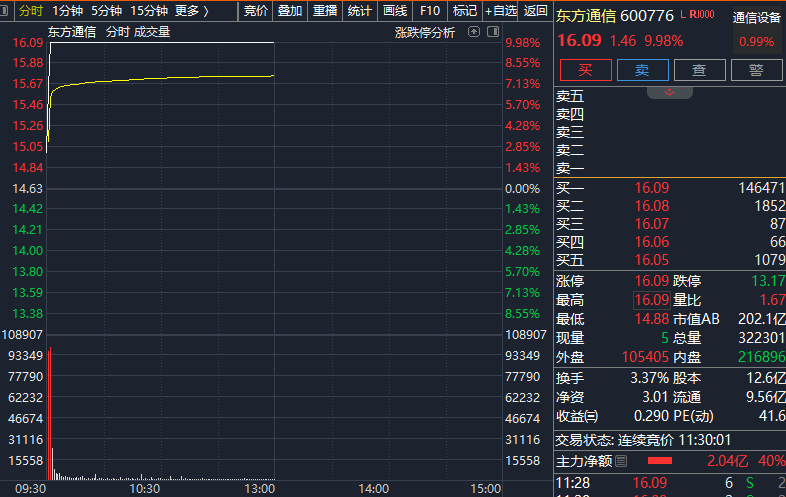 12月12日盘中,商业航天概念股再次爆发涨停潮。东方通信开盘后仅用一分钟就被资金直线拉至涨停,航天长峰、顺灏股份、再升科技、四创电子等个股也紧随其后纷纷封板。