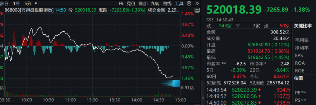 午后A股曾短暂冲高,但下午两点后微盘股开启大幅下跌模式,万得微盘股指数一度跌超1.4%,不少上午上涨的中小盘个股午后显著回落。