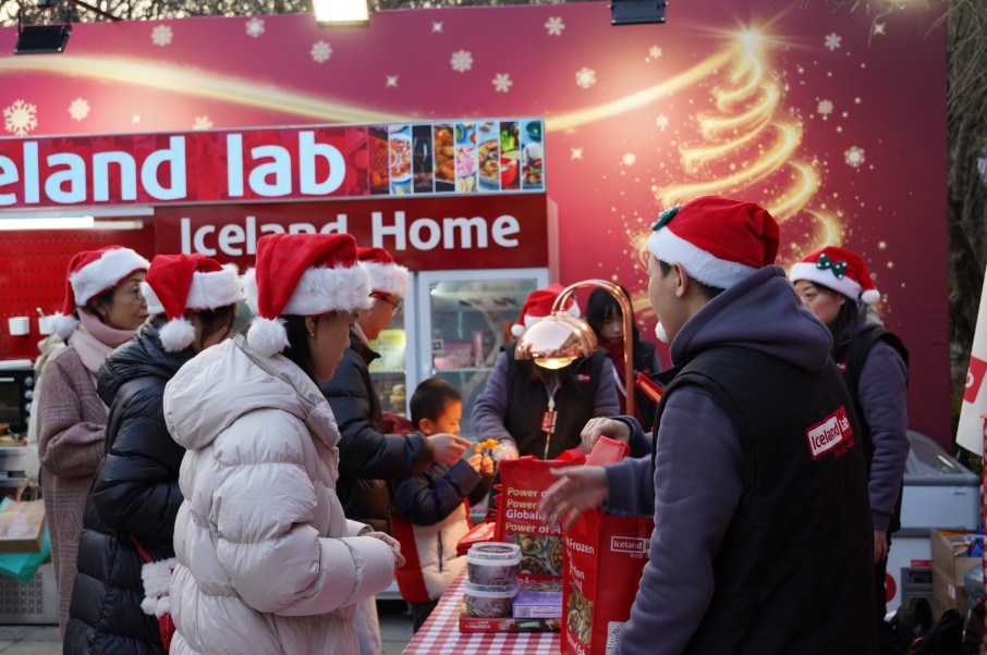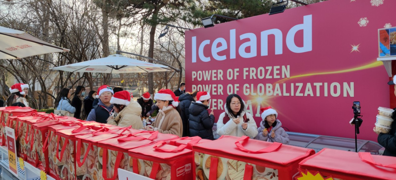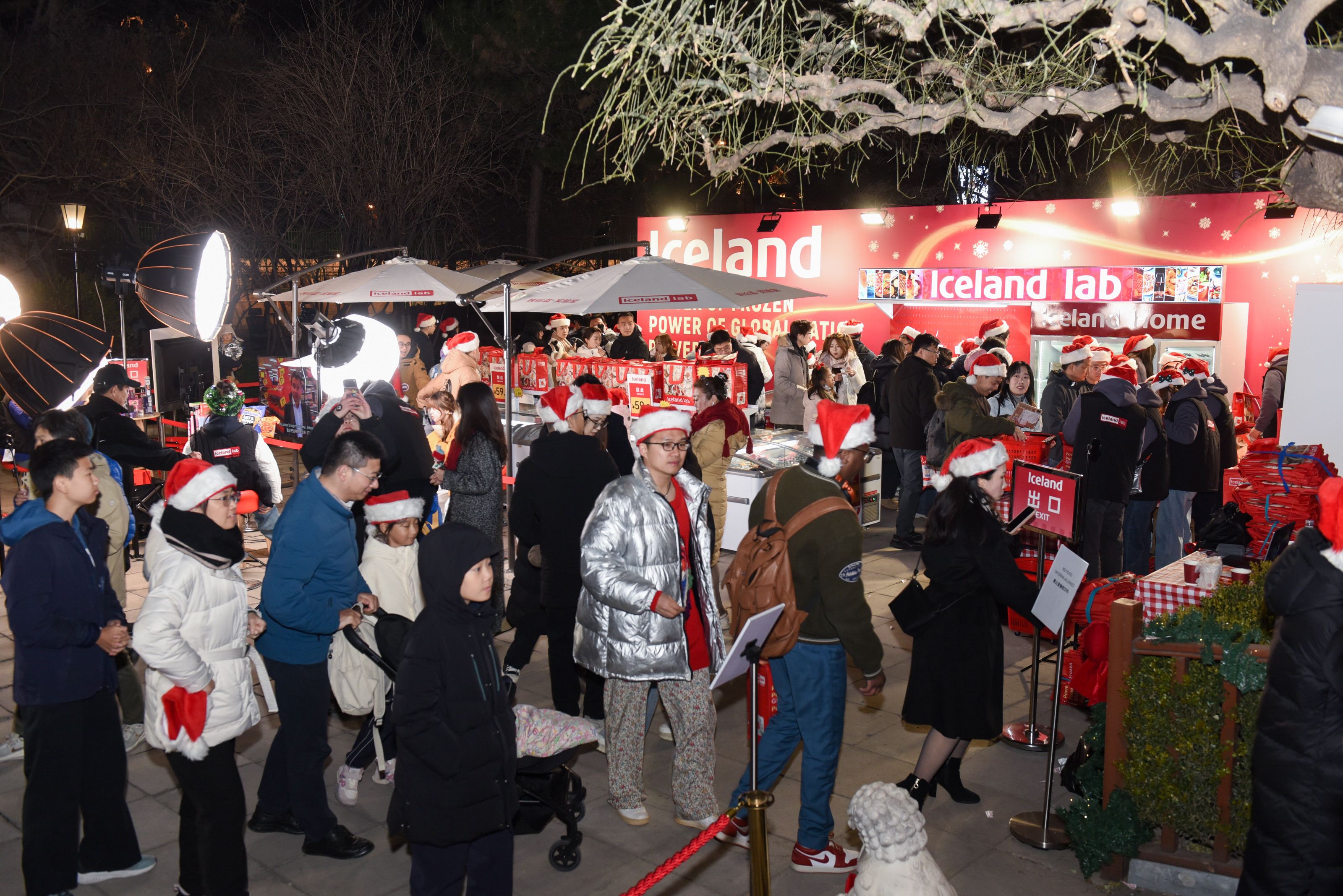 12月6日,英国驻华大使官邸圣诞开放日市集的草坪上,排队最长的区域并非圣诞老人互动点,而是冷冻食品品牌Iceland的摊位。