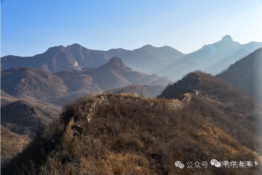 晨雾未散之际,阳光斜照在长城残垣上,为冰冷砖石镀上暖金光泽。烽火台断壁在光影中明暗交错,似在低语千年过往。山风掠过山谷,卷起枯草簌簌声,与长城砖缝里的回响交织,谱成山野独有的旋律。沿城垣望去,城墙随山脊起伏,时而隐入枯黄灌木丛,时而攀上陡峭山尖,每一处转角都藏着别样景致——或是远山在薄雾中若隐若现,或是山脚下村落炊烟袅袅,与苍茫山野绘就静谧冬日图景。