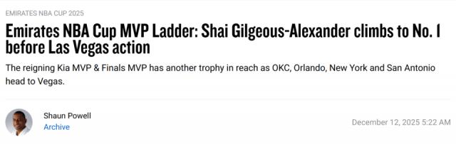 NBA杯MVP榜单更新:亚历山大登顶 尼克斯双星跻身前五