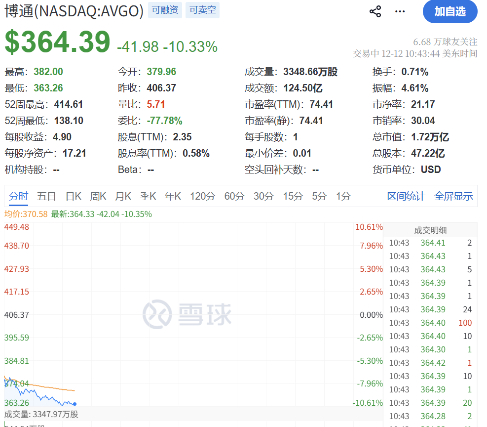 市场对人工智能领域的担忧情绪再度升温,科技股承压明显。继甲骨文股价周四暴跌后,芯片巨头博通成为新的焦点,其股价当日跌幅约10%。