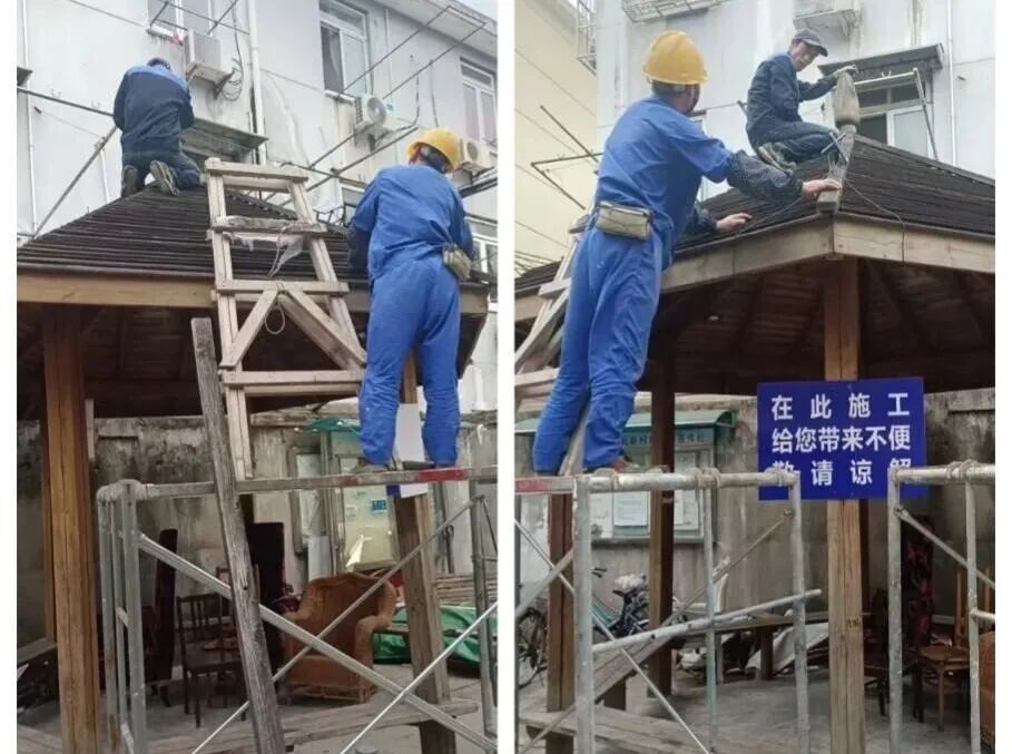 沪北新村651弄小区建成多年,凉亭曾是居民休闲小憩、拉家常的重要场所。经长期风吹雨打,凉亭顶棚漏雨,木质梁柱腐朽破损,既影响美观,更给活动居民尤其是老年群体带来安全隐患,修缮成了居民迫切期盼的事。聚焦这一民生诉求,沪北新村居民区党总支将其纳入“我为群众办实事”善治家园计划项目,以党建引领凝聚治理合力,推动修缮工作落地。