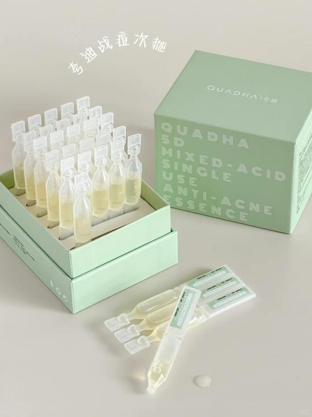 夸迪这款战痘次抛是经典的控油祛痘产品!主打水杨酸与乳糖酸的复合酸配方,搭配华熙生物5D透明质酸技术,能温和疏通毛孔、溶解老废角质,从源头减少油脂分泌和痘痘生成。次抛包装干净便携,一次一支,用量精准可控。