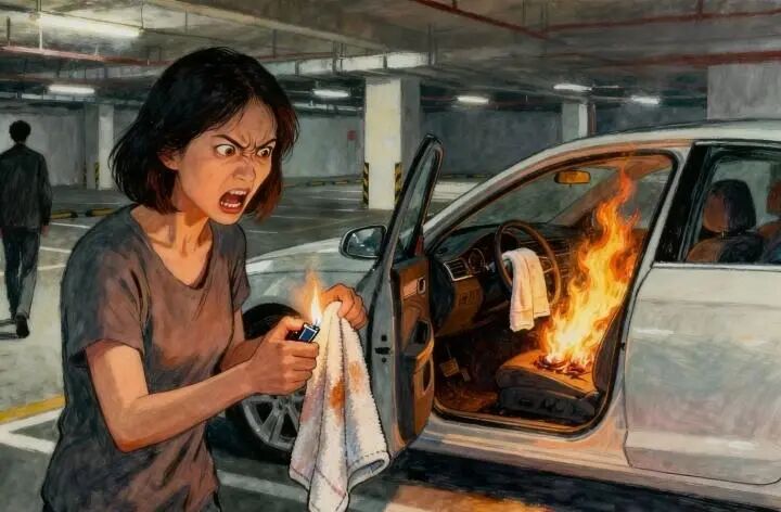 随后将燃烧的毛巾扔在男友轿车的主驾驶座位上