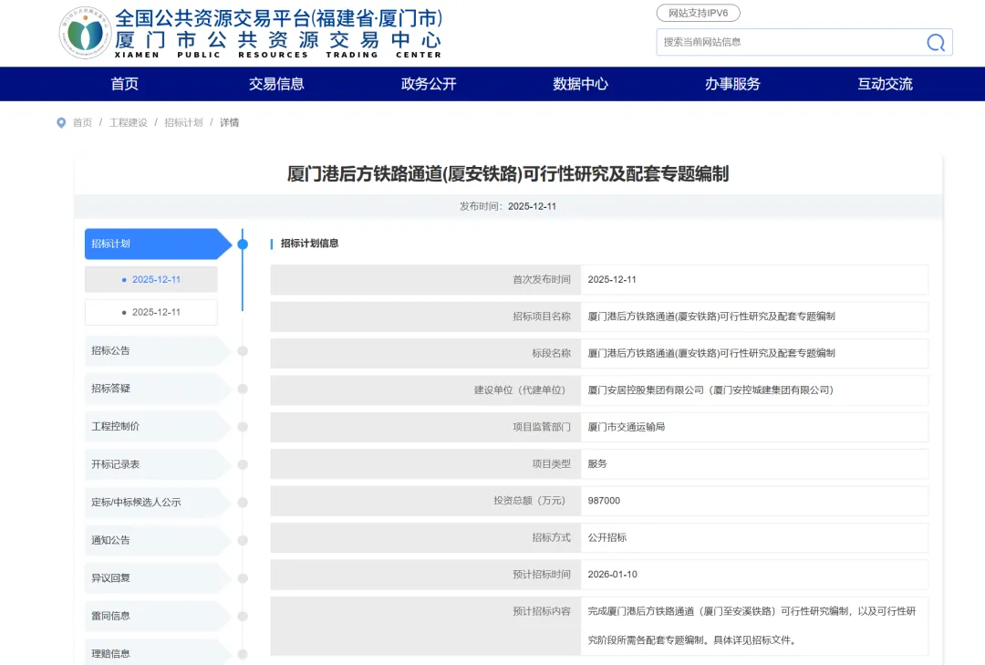 厦门市公共资源交易中心消息显示,12月11日,厦门港后方铁路通道(厦安铁路)可行性研究及配套专题编制项目启动公开招标。此次招标的核心任务是完成该铁路的可行性研究报告编制,同时开展可行性研究阶段所需的各项配套专题编制工作。
