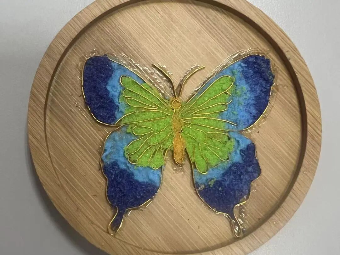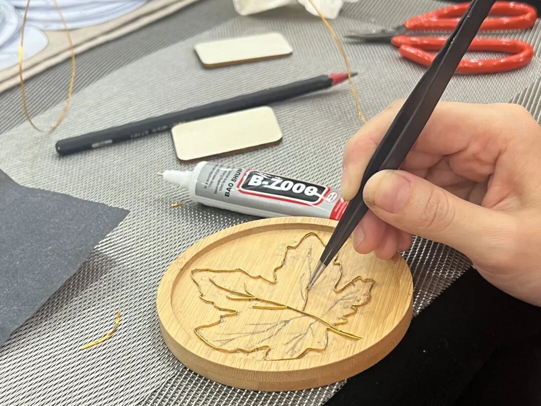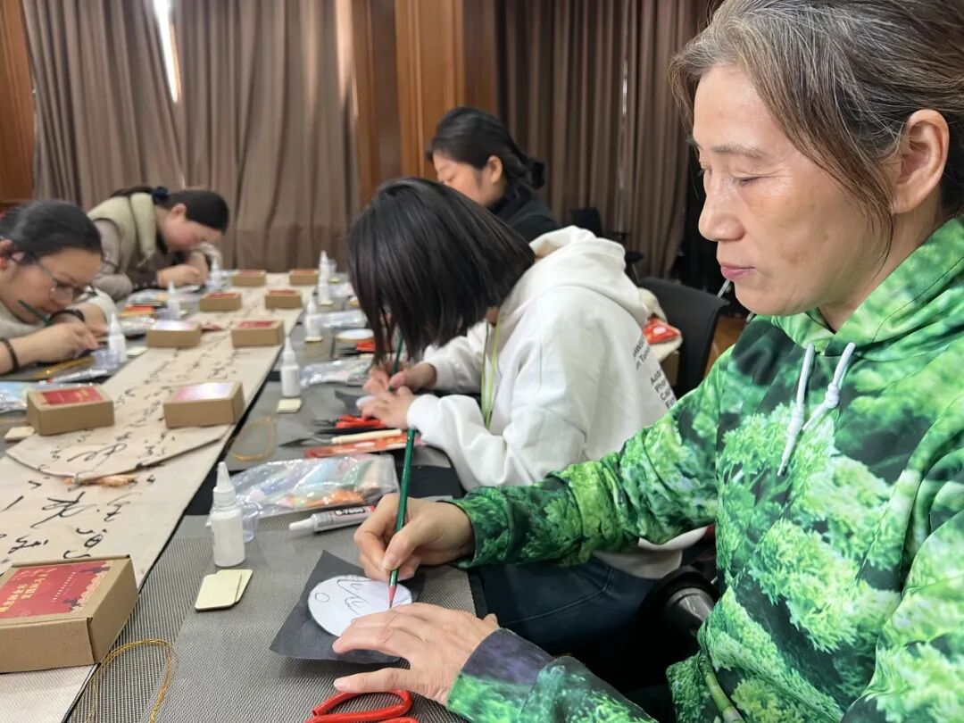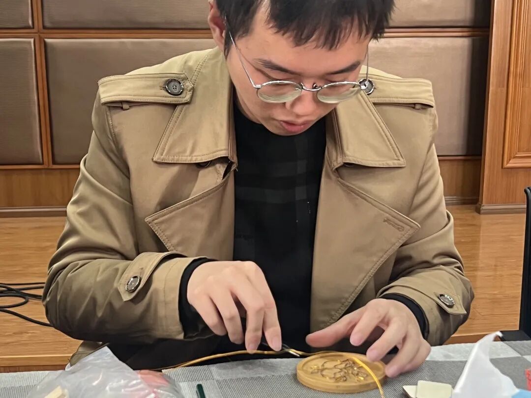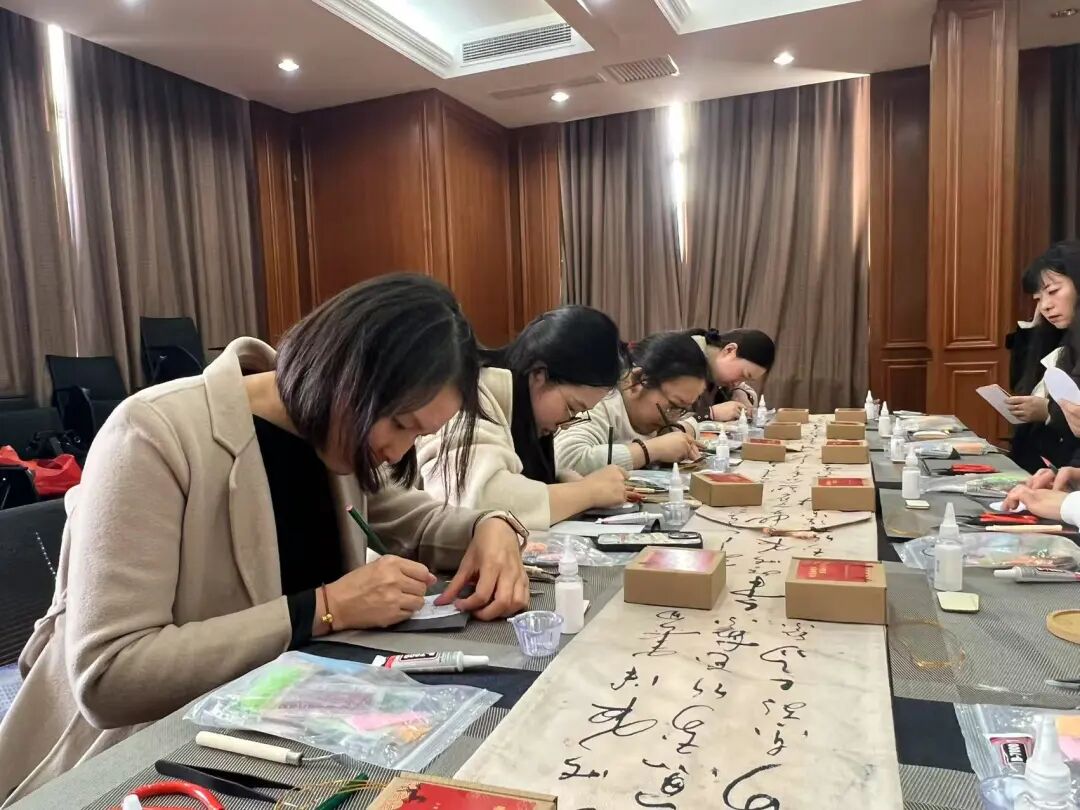 走进手工体验区,在指导老师的耐心讲解下,教职工们动手尝试掐丝珐琅这项非遗技艺。细扁的铜丝在指尖灵活弯折,形成流畅的线条,勾勒出树枝、熊猫等精美的纹样;然后用彩砂细心填充,釉色流转之间,一幅幅小巧精致的珐琅作品渐渐成型。金光与彩砂相互映衬,不仅让大家体验到静谧专注的手作乐趣,更在方寸之间展现出传统工艺的斑斓之美。一件件独一无二的作品陆续完成,每一件都凝聚着制作者的巧思和对新春的祝福,成为寒冬里一份温暖而特别的新年礼物。