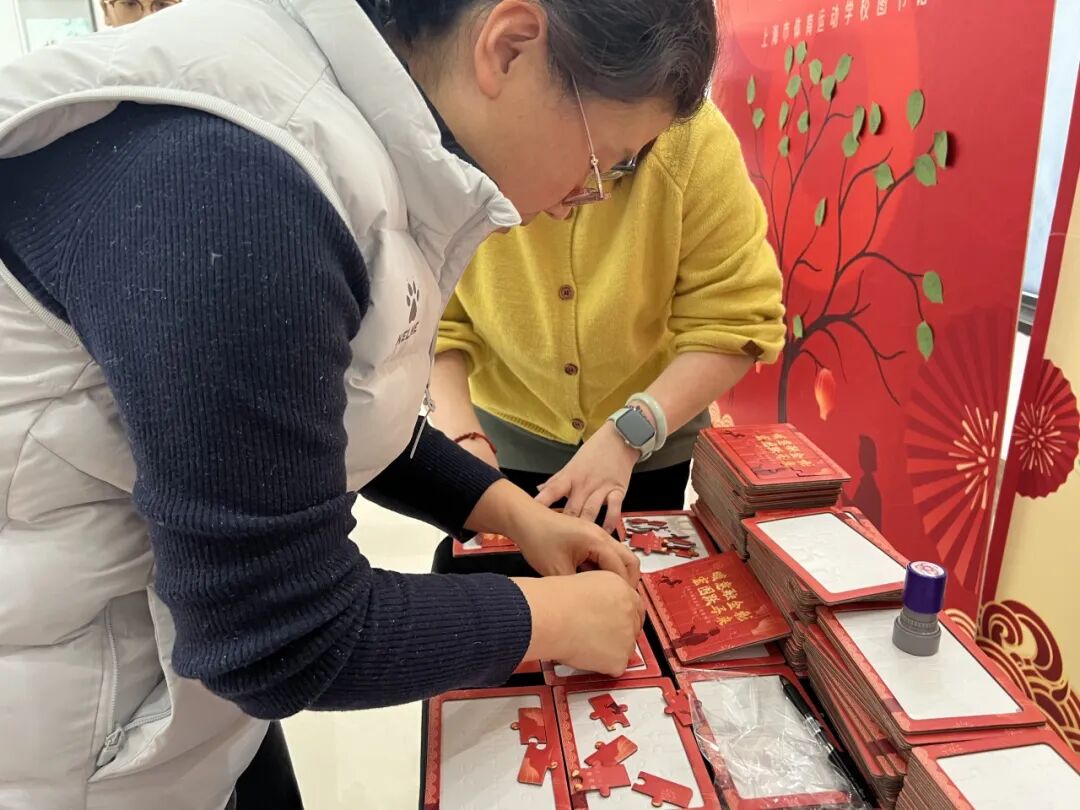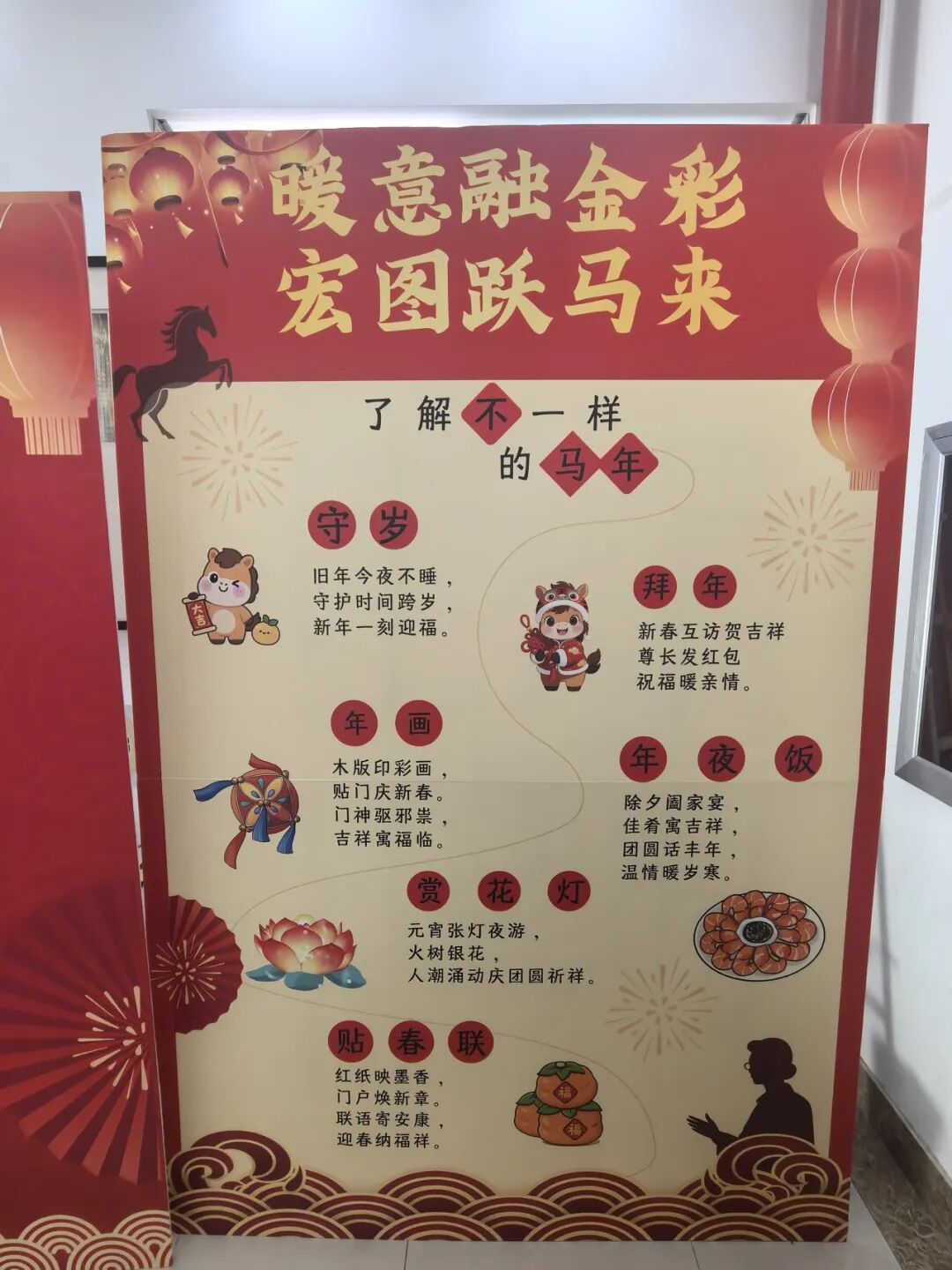 紧接着是“年俗绘卷”展板区。一幅融合了各地传统新年习俗的民俗长卷缓缓展开,从守岁、拜年、贴年画到赏花灯,从北方的窗花到南方的年糕,从祭灶迎春到守岁压岁,生动的图文清晰地勾勒出丰富多彩的春节文化脉络。展板旁边还特别设置了“骏马拼图”互动环节。教职工们把印有春节主题和骏马图案的碎片一块块拼合起来,随着一匹昂扬奔腾的骏马逐渐完整呈现,“龙马精神”“马到成功”的吉祥寓意也随之传递开来,象征着新的一年大家要奋蹄前行、开拓进取。