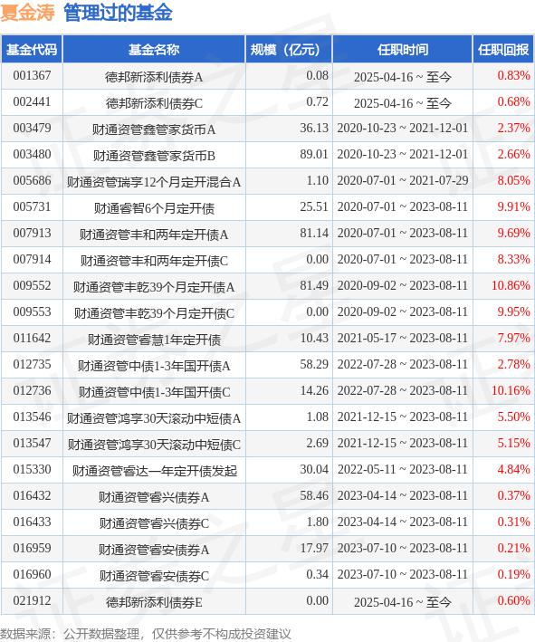 夏金涛先生拥有上海交通大学应用统计硕士学位。他于2016年3月加入财通证券资产管理有限公司,先后担任固定收益部产品经理助理、固收公募投资部基金经理助理等职。在财通资管期间,他曾管理多只公募基金:2020年7月1日至2023年8月11日担任财通资管睿智6个月定期开放债券型发起式基金经理;2020年7月1日至2021年7月29日担任财通资管瑞享12个月定期开放混合型基金经理;2020年7月1日至2023年8月11日担任财通资管丰和两年定期开放债券型基金经理;2020年9月2日至2023年8月11日担任财通资管丰乾39个月定期开放债券型基金经理;还曾任财通资管鑫管家货币市场基金经理;2021年12月15日至2023年8月11日担任财通资管鸿享30天滚动持有中短债债券型发起式基金经理;2022年7月28日至2023年8月11日担任财通资管中债1-3年国开行债券指数基金经理;2021年5月17日至2023年8月11日担任财通资管睿慧1年定期开放债券型发起式基金经理;2023年4月14日至2023年8月11日担任财通资管睿兴债券型基金经理;2022年5月11日至2023年8月11日担任财通资管睿达一年定期开放债券型发起式基金经理;2023年7月10日至2023年8月11日担任财通资管睿安债券型基金经理。2023年8月,夏金涛加入德邦基金,现任公司固收研究部总经理。2025年4月16日起担任德邦新添利债券型基金经理,2025年8月26日起担任德邦如意货币市场基金经理。