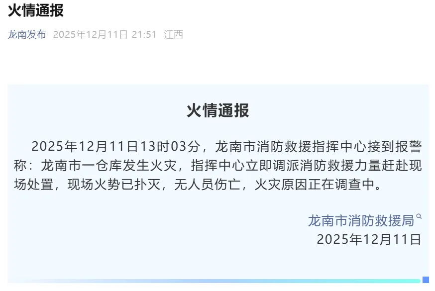 12月11日,江西龙南市龙南镇一处物流仓库及周边建筑发生火灾。经核实,此次事故未造成人员伤亡,目前起火原因仍在进一步调查中。