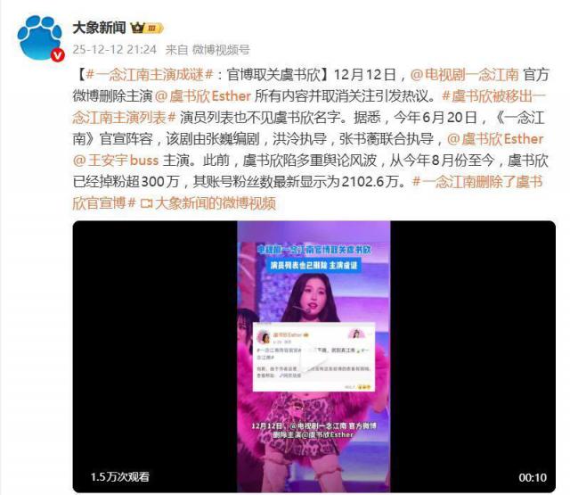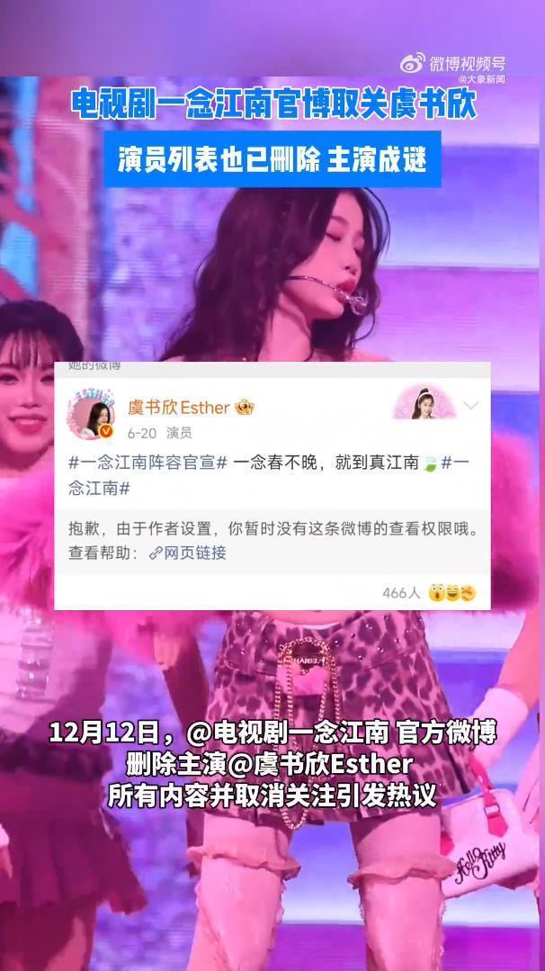 12月12日,电视剧《一念江南》官方微博的操作在娱乐圈引发关注:删除了所有与虞书欣相关的内容,还取消了对她的关注,被网友称为“教科书级商业切割”。