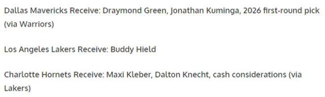 ESPN提出的具体交易框架如下:勇士得到安东尼·戴维斯和梅森·普拉姆利;独行侠获得德雷蒙德·格林、乔纳森·库明加以及勇士2026年首轮选秀权;湖人得到巴迪·希尔德;黄蜂则收获马克西·克莱伯、道尔顿·克内希特和湖人提供的现金补偿。从理论上看,这是一笔充满话题性的交易,但实际操作中的考量远比纸面分析复杂。