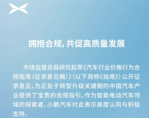 小鹏汽车称,将以《指南》为重要参照,全面审视并优化价格管理与合规体系,确保从产品定价到销售服务各环节更透明规范。承诺严格遵守明码标价原则,保障消费者知情权与选择权,杜绝价格欺诈与不正当竞争行为。
