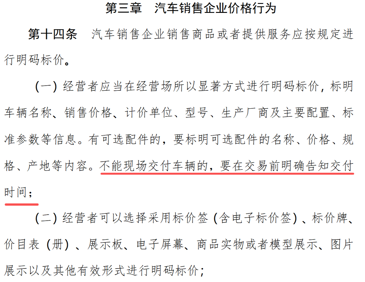 此外,意见稿特别提到,无法现场交付车辆的,需在交易前明确告知交付时间。这一针对性条款,被业内普遍认为直指近年网红车型的交付难题。