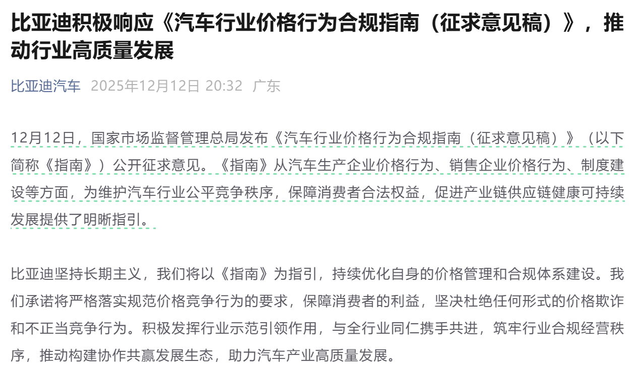 比亚迪表示,将以《指南》为指引,持续优化价格管理与合规体系建设。承诺严格落实规范价格竞争行为的要求,保障消费者利益,杜绝价格欺诈和不正当竞争行为。发挥行业示范作用,与同行携手筑牢合规经营秩序,推动构建共赢生态,助力汽车产业高质量发展。