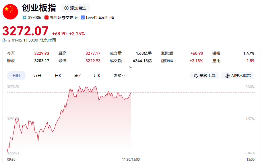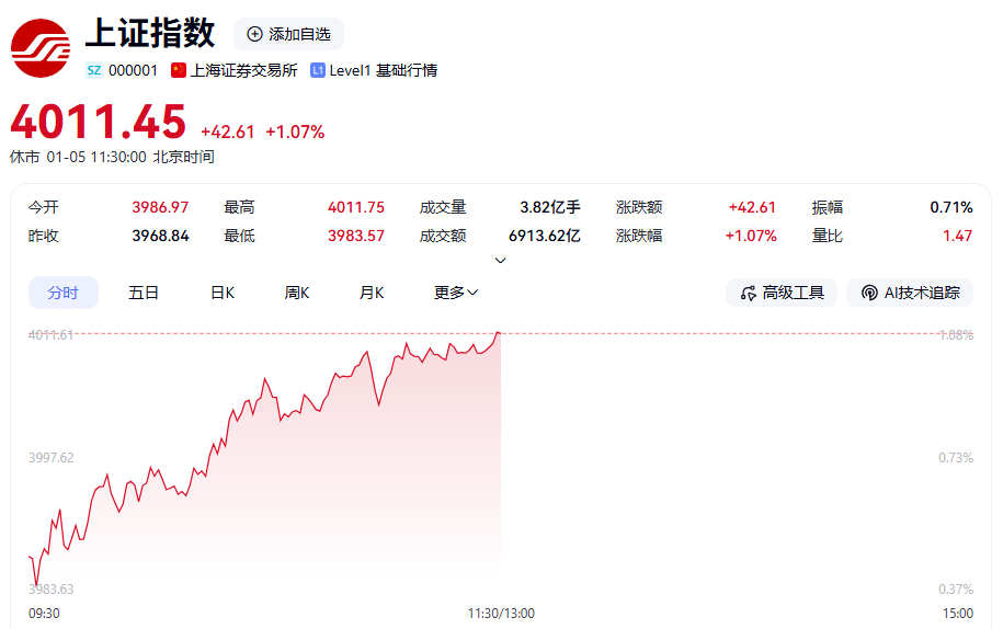 2026年首个交易日上午,A股市场整体上行态势显著,主要指数均实现不同幅度上涨。截至中午收盘,上证指数上涨超1%,报4011.45点,再度站上4000点整数大关;深证成指涨幅接近2%。