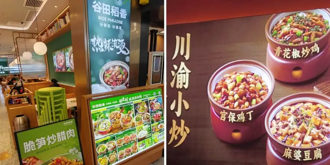 有趣的是,不远处拐角就是经营近两年的乡村基门店,主打川味现炒。二者同属乡村基集团,2025年两大品牌全国直营门店超2000家,大米先生已开放合伙模式。两大品牌覆盖川湘热门菜系,以现炒模式成为区域人气焦点。