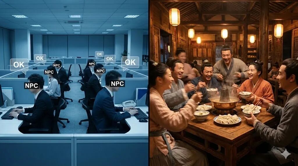 同福客栈最让人动容的是反内耗的职场关系。2026年职场流行“NPC心态”,为保护自己,我们把同事当NPC,沟通只用“收到”“好的”“1”,下班成陌生人,离职退群即相忘。