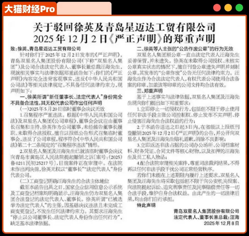 6天后,汪海也登报回应,指出徐英召开的董事会未通知他参加,程序不合法,且已提起诉讼。