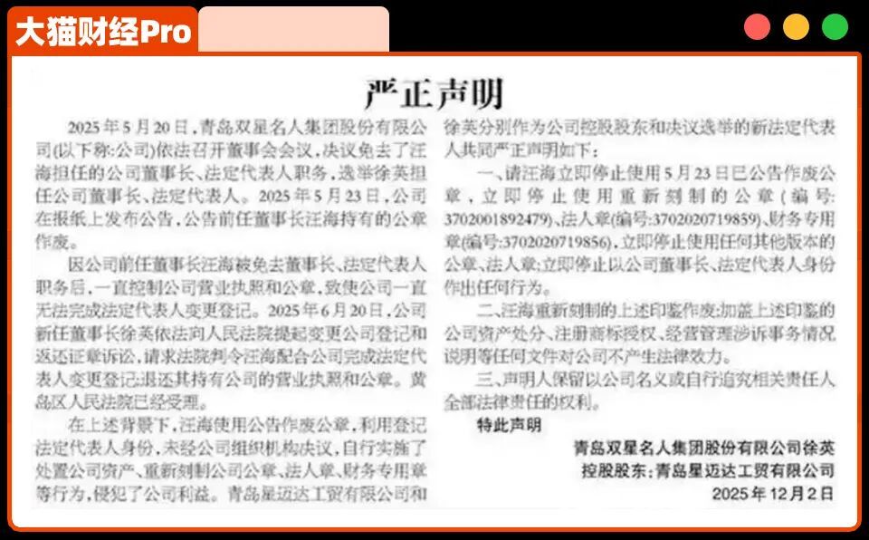 5月,徐英成为双星名人董事长并启用新公章,12月更是登报发布声明。