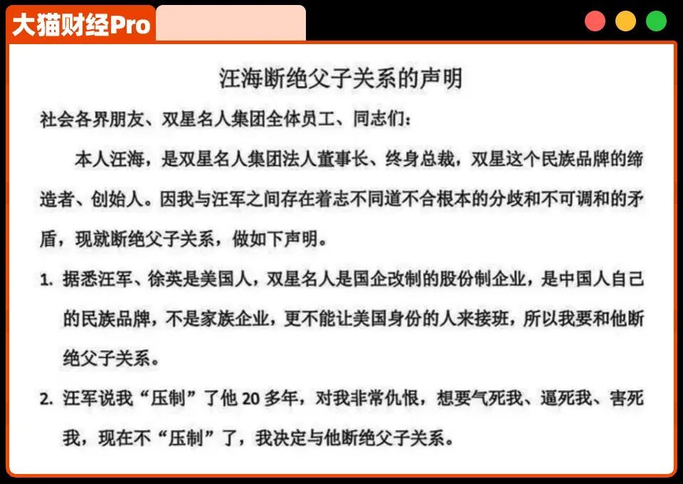 这份声明洋洋洒洒列出11条内容,首条便点明“汪军、徐英为美国籍”,强调民族品牌不应由外籍人士继承。