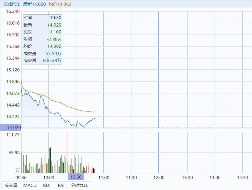 1月5日开盘后,长城汽车A股、H股双双低开低走,H股盘中最大跌幅达7.28%。截至收盘,A股下跌1.46%,H股下跌6.15%。