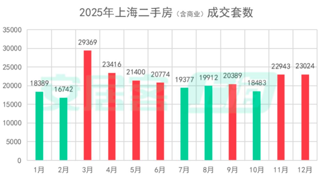 据安居客上海统计,2025年12月,上海二手房(含商业)成交量再度突破2.3万套,成为全年仅次于“金三银四”的第三高点,并且连续两个月成交超过2.2万套,创下近8个月新高。