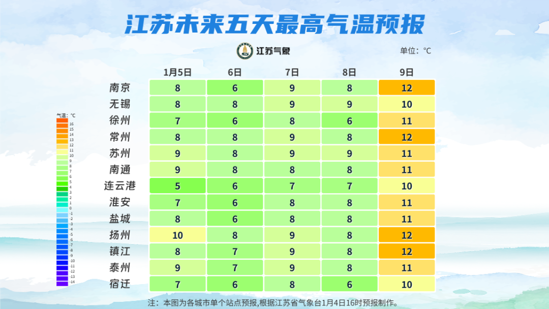 根据江苏气象最新资料,未来一周冷空气依旧活跃。5日至8日,全省气温回升缓慢,最高温度普遍在个位数波动,最低气温仍在冰点附近徘徊。9日起,江苏最高气温将全部重回10℃以上,公众外出仍需注意保暖。