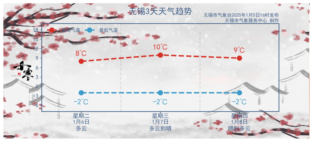 6日至11日,无锡以晴到多云天气为主,12日云系会增多。6日至9日的最低气温均在0℃以下,白天最高气温约10℃。