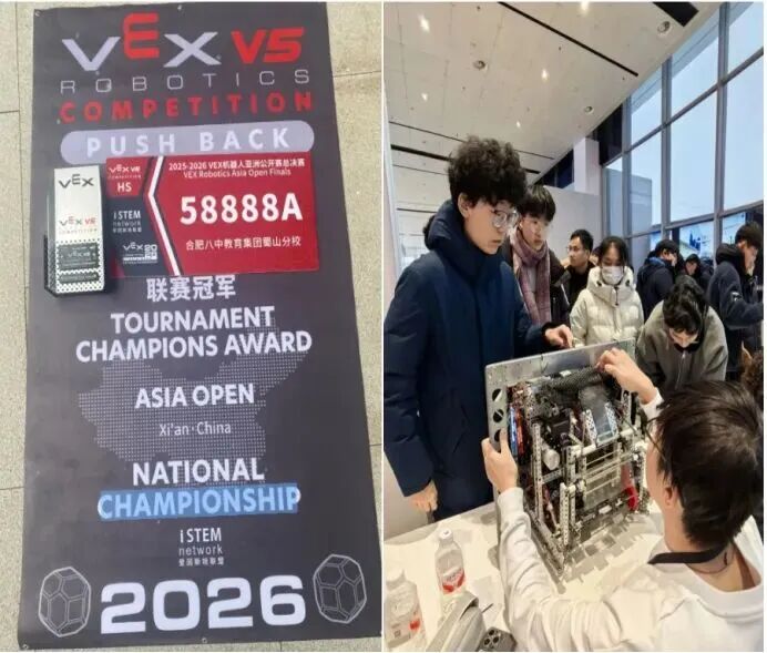 元旦伊始,科创少年们便在赛场上绽放光彩。2025—2026赛季VEX机器人亚洲公开赛总决赛于1月1日在西安圆满落幕。合肥八中教育集团蜀山分校的王嘉佑、彭启洋、夏佐三位同学组成的战队,在全国近700支精英赛队、2500余名科创少年中脱颖而出,成功摘得全国总冠军,并获得了4月举办的VEX机器人世界锦标赛的参赛资格。这一优异成绩不仅展现了学校科创教育的显著成果,更是蜀山区深耕科技教育、培育创新人才的生动体现。