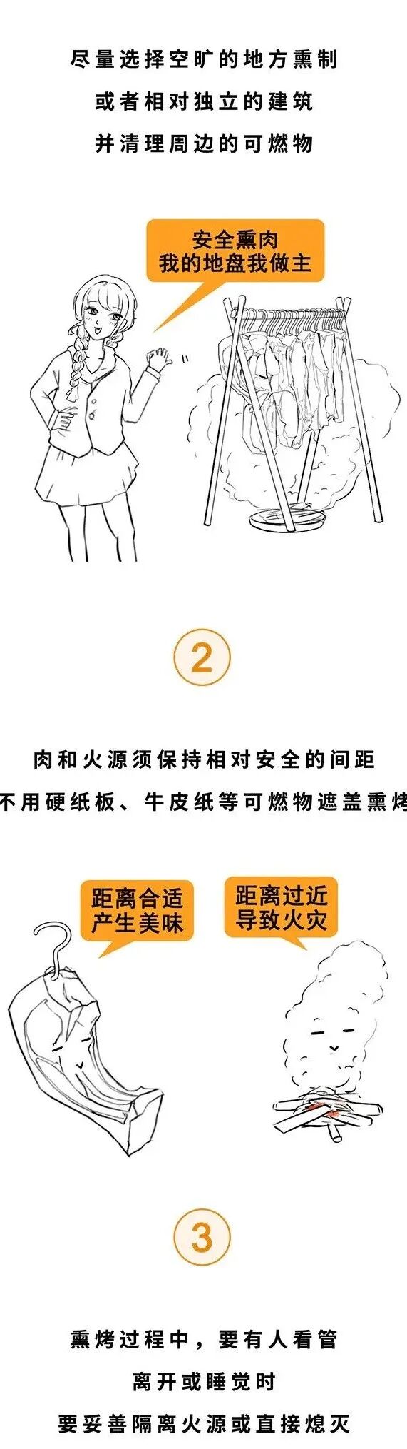 安全提醒:腊味虽美味,熏制需谨慎。熏烤过程中务必有人全程看管,远离易燃物品,选择空旷、通风的安全区域,避免在室内或杂物间等狭窄空间操作,防止火灾事故发生。