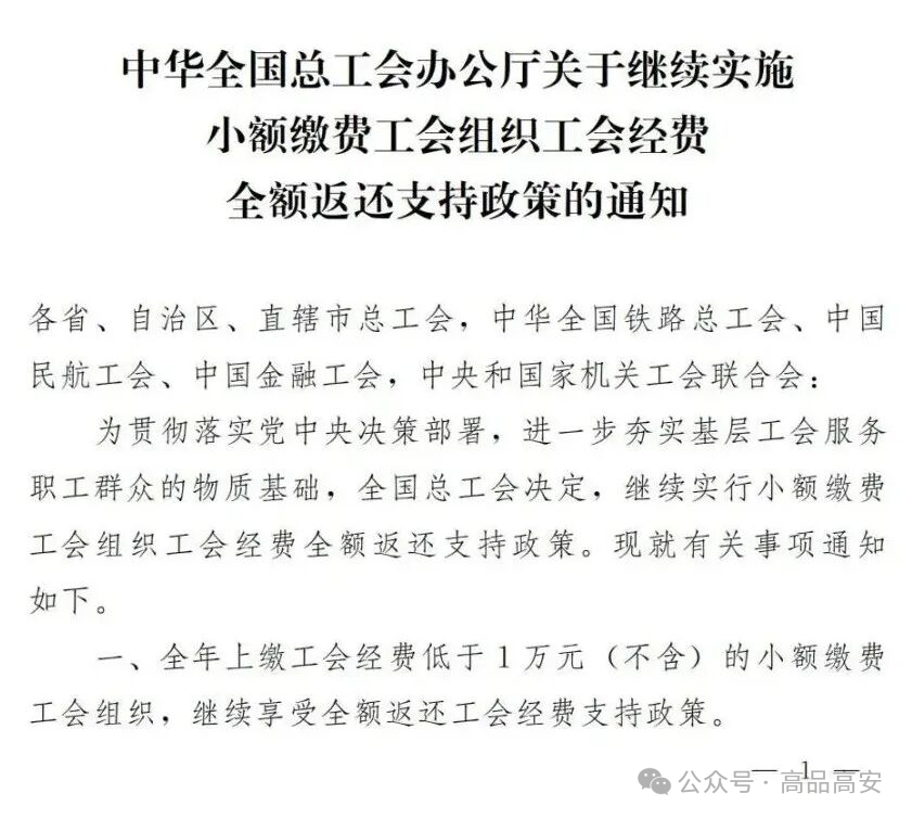 近日,全国总工会发布重要通知,明确小额缴费工会组织工会经费全额返还支持政策将延续执行至2026年12月31日,具体实施要求按照《中华全国总工会办公厅关于继续实施小额缴费工会组织工会经费全额返还支持政策的通知》(总工办发〔2024〕29号)文件执行。