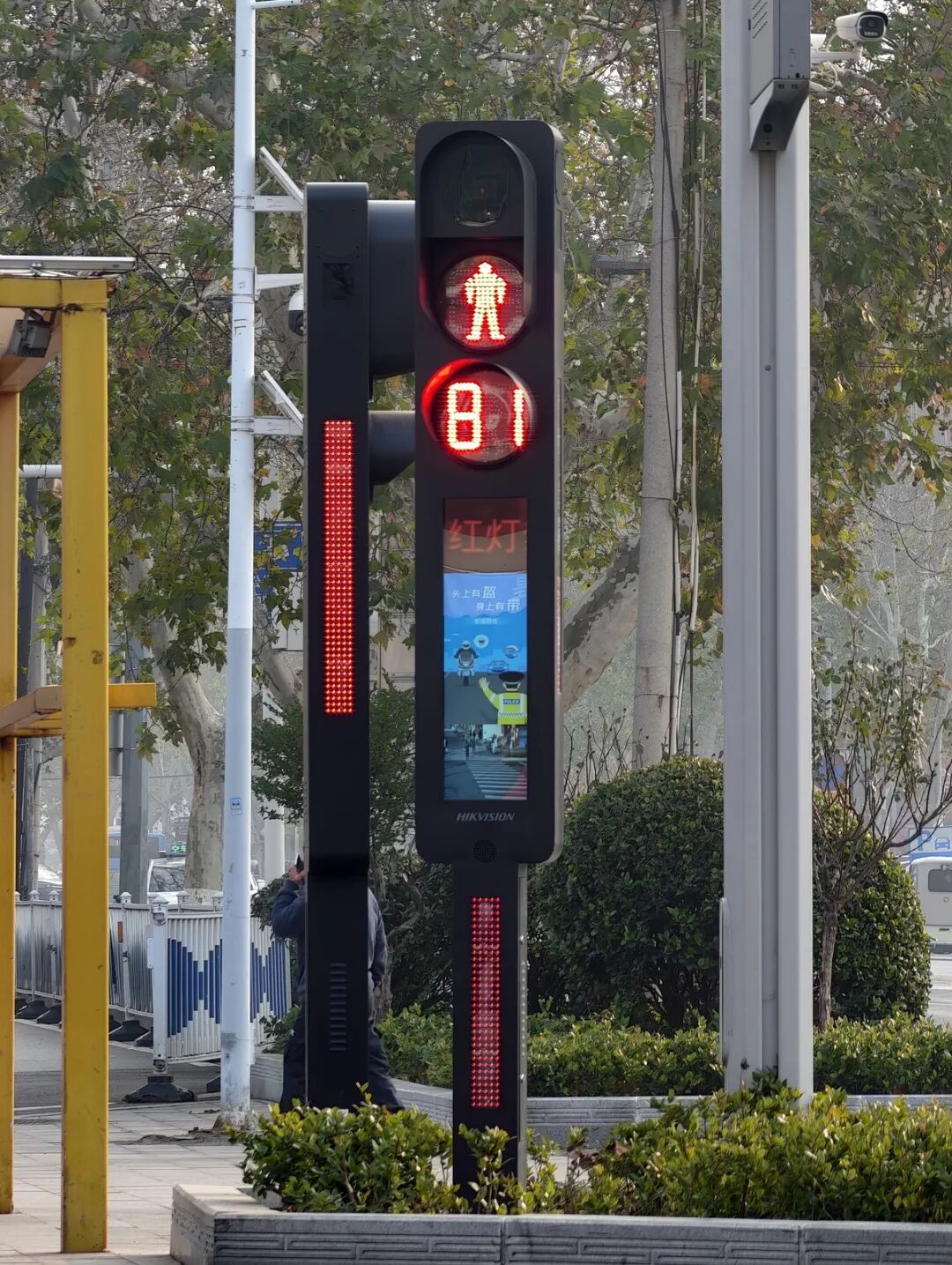 记者在现场看到,8套立柱式智能一体化行人信号灯矗立在该路口4个方位,灯身集成高清摄像头、彩色LED显示屏和定向喇叭。这款新型设备通过AI算法与视频检测技术联动,可精准识别行人、非机动车闯红灯、逆行等交通违法行为。