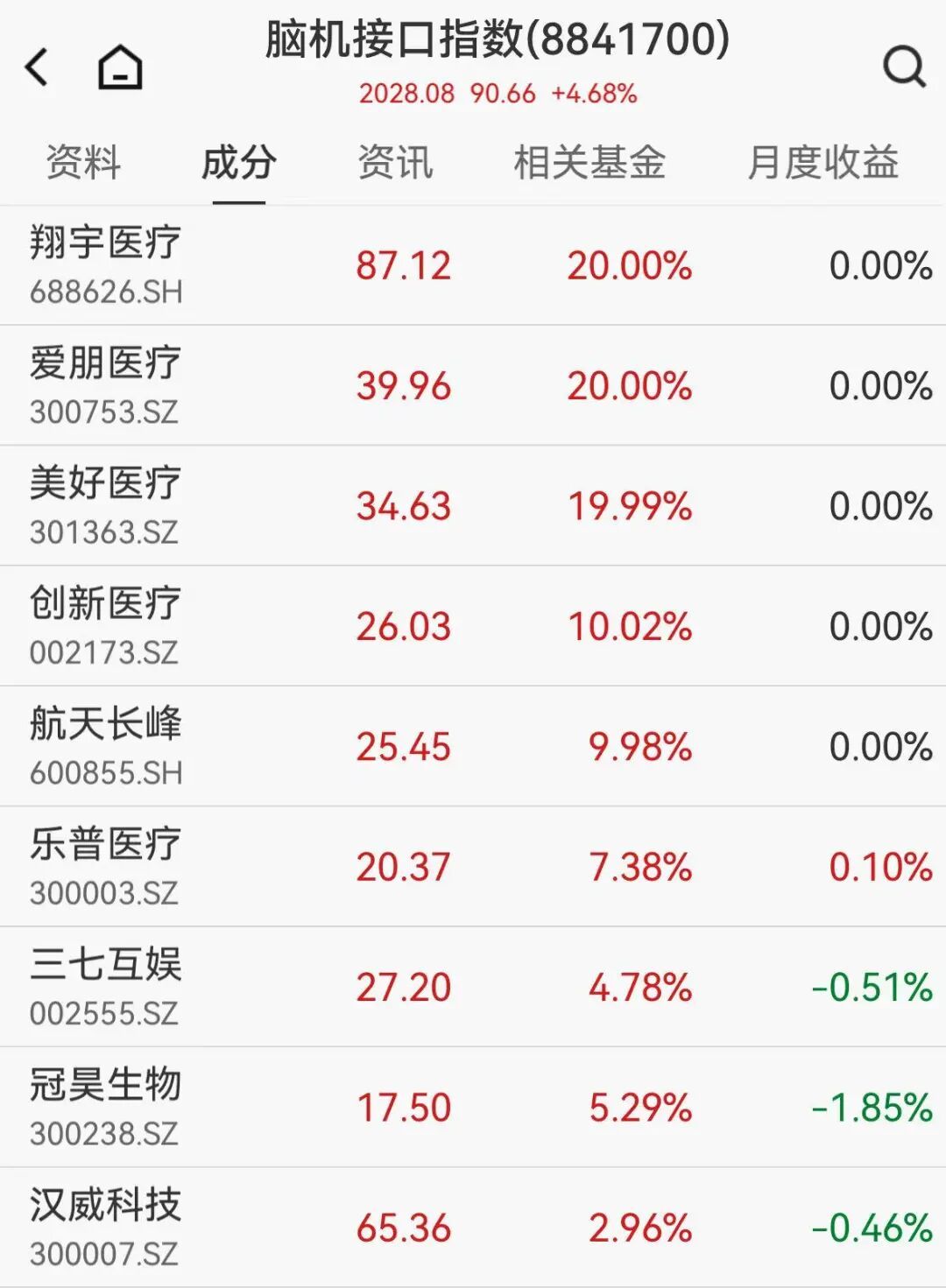 脑机接口板块持续爆发,翔宇医疗、爱朋医疗斩获20CM涨停,板块内多只个股同步大涨,成为早盘市场焦点之一。