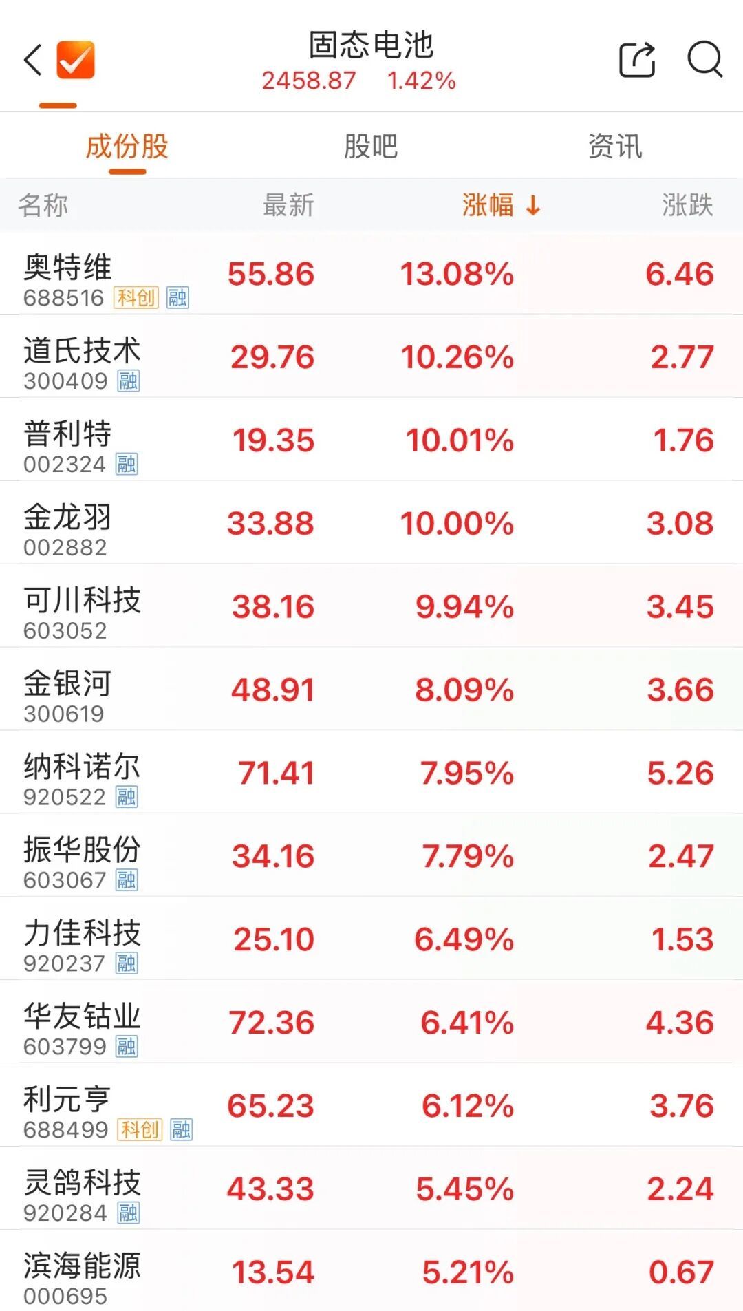 固态电池概念在昨日午后异动基础上,今日早盘再度拉升。普利特开盘即封涨停,金龙羽盘中直线冲高涨停,奥特维、道氏技术涨幅超10%,可川科技、纳科诺尔、利元亨等个股纷纷跟涨。