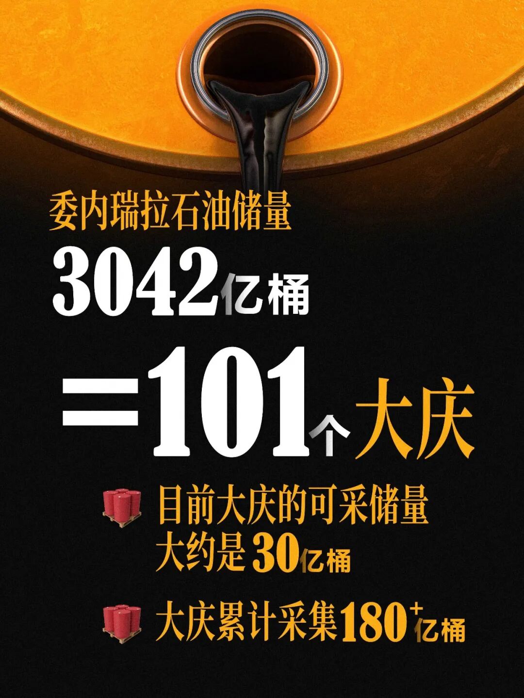 若与我国的大庆油田相比,目前大庆油田的可采储量约为30亿桶,如此算来,一个委内瑞拉的石油储量就相当于101个大庆油田。